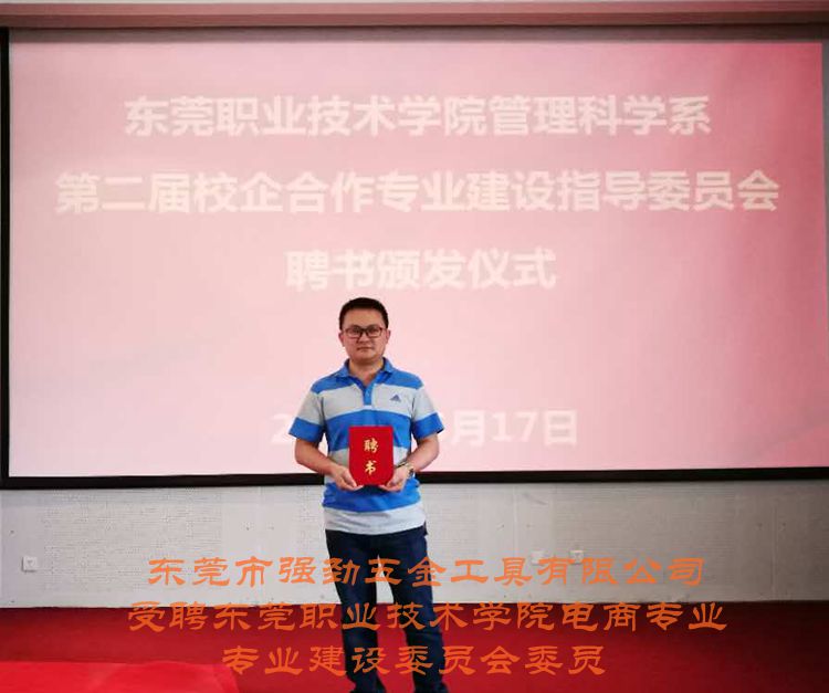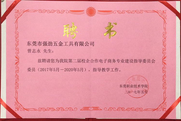 東莞市強勁五金工具有限公司獲得東莞職業(yè)技術(shù)學院聘書,成為管理科學系校企合作專業(yè)建設委員會委員單位。